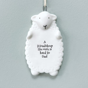 Celebrate friendship with this charming “Friendsheep Like Ours Is Hard to Find” hanging plaque. Made from delicate porcelain, this adorable sheep-shaped decoration adds a heartfelt touch to any home. Featuring a rustic-style design with a sweet message, it’s a perfect gift for a best friend or loved one. Hang it in a cosy space as a reminder of a truly special bond.