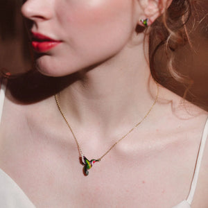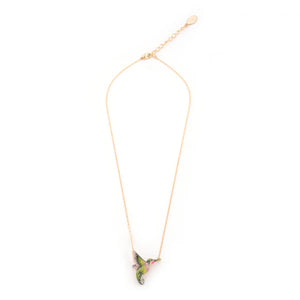 Crafted with meticulous enamel detail and dipped in 18ct gold plating, this delicate necklace from Bill Skinner brings the iridescent magic of a hummingbird to your neckline. The pendant’s vibrant greens, pinks, and purples shimmer as it hovers gracefully from a fine gold chain. Elegant, joyful, and just a little bit whimsical.