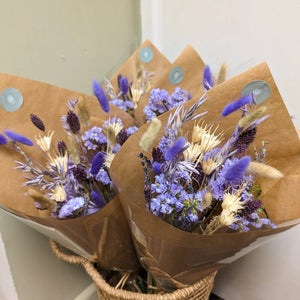 - Hand-selected dried flowers in soft purples, creams, and neutrals