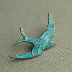 This exquisite Small Verdigris Swallow Brooch is a beautifully detailed brass stamping, hand-treated in Edinburgh to develop a unique verdigris patina. The delicate blend of turquoise, deep blue, and hints of gold creates a timeless, vintage-inspired look that makes this brooch a standout accessory.