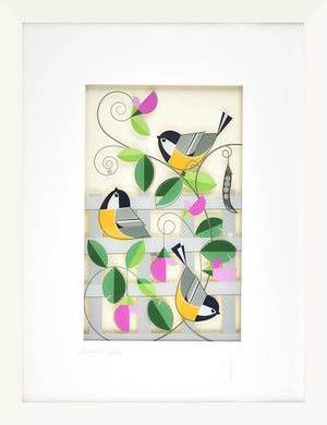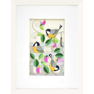 Sweet Pea is a joyful framed print that brings together three coal tits dancing around a trellis woven with delicate sweet pea blossoms. With vibrant pops of pink and green and a layered acrylic design that casts soft shadows, this piece adds movement, colour, and whimsy to any wall.