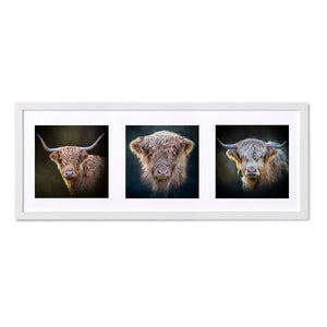 Celebrate the beauty of Scotland’s beloved Highland cows with The Fluffy Herd Framed Print. Featuring a striking triptych of three detailed Highland cow portraits, this elegant framed print is perfect for adding a touch of rustic charm to any home.