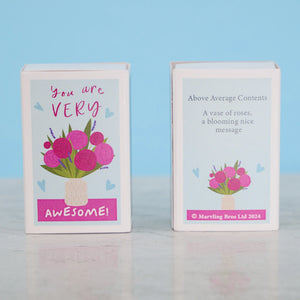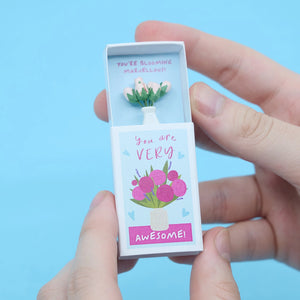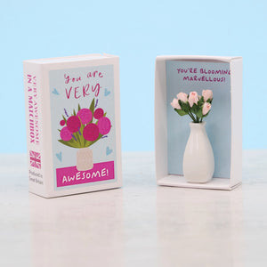 Inside this charming matchbox, the recipient will discover a tiny handcrafted vase filled with pink roses, accompanied by the heartfelt message: “You’re Blooming Marvellous!”