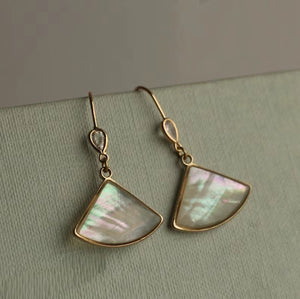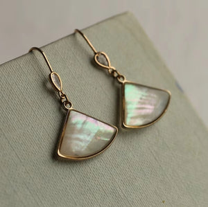 Add a touch of vintage glamour to your jewellery collection with these exquisite Abalone Pearl Fan Earrings. Inspired by the elegance of the Art Deco era, each earring features a delicate, wafer-thin piece of Mother of Pearl, encapsulated in glossy resin for a radiant, light-catching effect. The iridescent sheen of the pearl creates a mesmerising glow, shifting beautifully with movement.