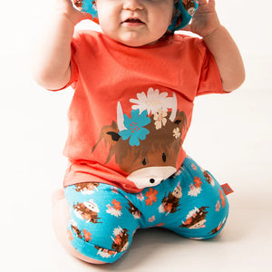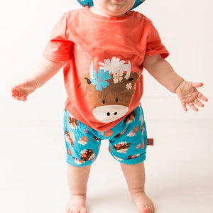 Sunshine called, and Bonnie answered. These playful muslin shorts feature our iconic Highland Cow surrounded by cheerful blooms, now in a cool, summery cotton that’s perfect for tiny adventurers.