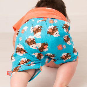 Bonnie Highland Cow Muslin Shorts – Blue Moo-d Edition