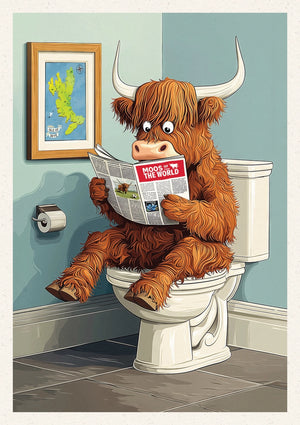 This cheeky unframed art print captures a moment of pure bovine brilliance—a wide-eyed Highland cow caught mid-read on the loo, brushing up on its “Moos of the World.” With quirky details like a toilet roll holder, a map of the Isle of Skye, and a wonderfully tiled bathroom, this print brings a whole new meaning to toilet humour (the good kind).