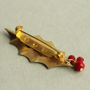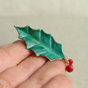 This vintage-inspired holly leaf brooch is pure festive charm with a chic twist. Crafted from brass and hand painted to perfection, it features luscious layers of deep green and turquoise verdigris, delicately edged in gold for that touch of yuletide luxe. Three glossy red berry beads dangle playfully from the tip - because why stop at elegant when you can add a little cheer?