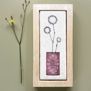 This handcrafted flower artwork is a sweet nod to the memories that make a house a home. Framed in natural wood and stitched with soft fabric, it features three threadwork florals blooming from a pink pot that reads “Home is where happy memories grow.” It’s charming, minimal, and quietly sentimental—just the thing for a shelf, mantle, or bedside.
