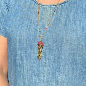 Designed by Bill Skinner, this elegant-yet-playful pendant features a sculpted resin jellyfish in vibrant pink, suspended from a shimmering gold-plated chain set with faceted crystals. Its tentacles trail in gleaming tendrils that move with you, catching the light with every step.