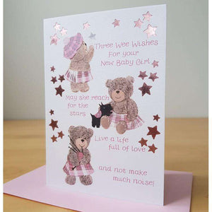 A new arrival calls for something a little bit special. This adorable new baby girl card features three sweet tartan-clad teddy bears, each sending a “wee wish” for the little one’s future – from stargazing to snuggles (and hopefully, not too many midnight tantrums). Finished with shimmering holographic foil stars, it’s charming, cheerful, and just the right mix of sentimental and Scottish.