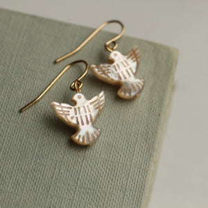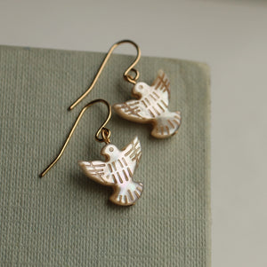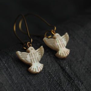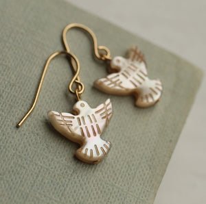 Add an elegant touch to your jewellery collection with these Pearl Dove Bird Earrings. Crafted from carved mother of pearl, these delicate dove-shaped earrings shimmer beautifully as they catch the light. Suspended from gold-plated brass ear wires, they offer a timeless and graceful look.