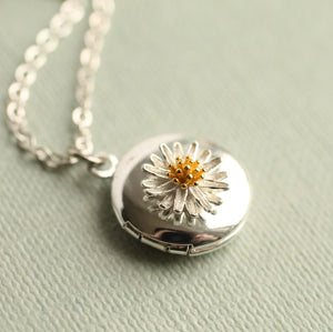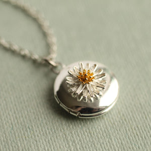 This tiny silver locket may be dainty in size, but it’s bursting with charm. A finely detailed daisy sits proudly atop the polished round pendant - its delicate white petals and golden centre are the perfect nod to sunshine and wildflower fields. Inside, there’s just enough room for a miniature photo or tiny memento, making it a personal piece with a playful twist.