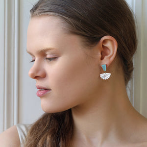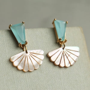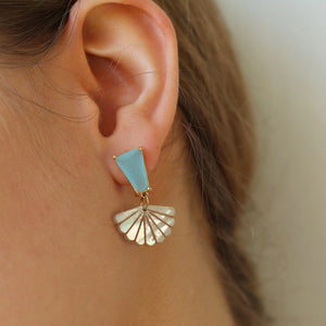 Featuring a crisp fan of mother of pearl that catches the light like a sun-dappled wave, each earring is topped with a bold geometric stone in turquoise opal glass, sleek, sculptural, and slightly siren-esque. Gold-plated brass settings and post-back fastenings complete the look with just the right amount of polish.