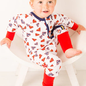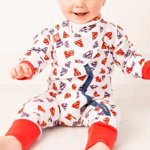 This officially licensed DC Comics™ Superman™ “Saves the Day” Romper is designed for baby heroes in training. The crisp white base pops with an all-over red and yellow Superman™ shield print, while bold red cuffs and navy zip details bring the comic-book charm. The two-way vertical zip makes changes faster than a speeding bullet, and the foldable cuffs keep things cosy from nap time to rescue missions.