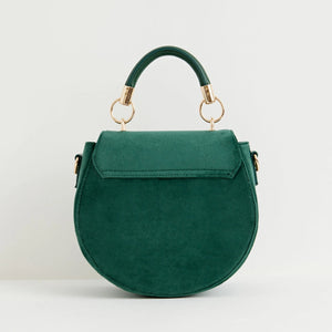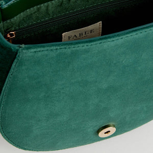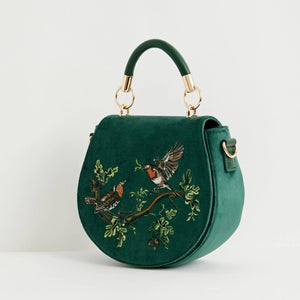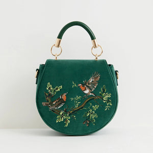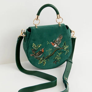 Made from recycled, vegan-friendly materials, its rich fern green velvet surface is embroidered with two robins perched on a branch, symbols of luck, joy, and renewal. The rounded saddle silhouette balances beauty and practicality, with a structured top handle and an adjustable cross-body strap for versatile wear. A secure magnetic fastening keeps your treasures safe, while the spacious interior makes it as functional as it is charming.