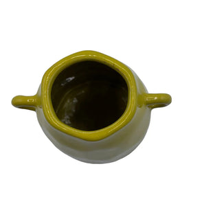 Made from ceramic with a smooth gloss glaze, it features a warm yellow body, contrasting pastel pink rim, soft blue base and an off-centre cylindrical form that looks good from every angle.