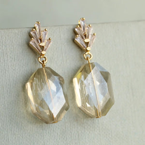 A little Gatsby, a little glass of bubbly - these dazzling Art Deco drop earrings are your shortcut to vintage glamour without raiding your gran’s jewellery box. Featuring beautifully faceted champagne yellow glass jewels that shimmer with hints of silvery blue, these earrings bring serious old-Hollywood energy to any look.