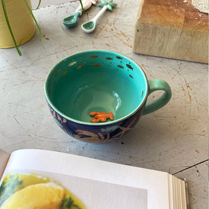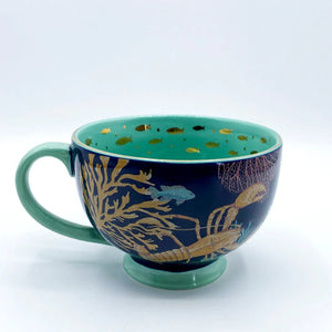 Meet the Coral Lobster Cup – where your tea takes a deep-sea dive into style. With a cheeky little ceramic lobster lounging at the bottom, this oversized porcelain teacup is pure undersea magic. The inside is a glossy turquoise wonderland, dotted with shimmering goldfish, while the outside wraps you in a vibrant seascape of crabs, coral, and starfish – all tied together with a luxurious gold rim. It’s like sipping from the sea… minus the salt.