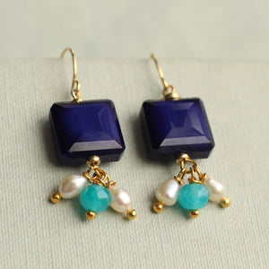 Our Lapis Lazuli Blue Charm Earrings are a vibrant celebration of colour and form. A faceted, deep navy glass square anchors each earring, suspended from a gold-tone hook. Beneath, a playful trio of charms dances with every movement: a glossy freshwater ivory seed pearl, a seafoam aqua opal glass bead, and a faceted turquoise gem.