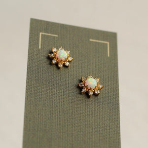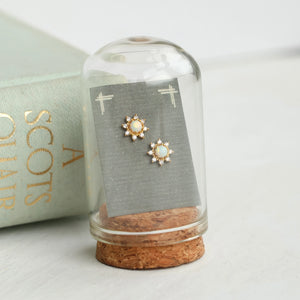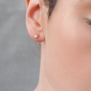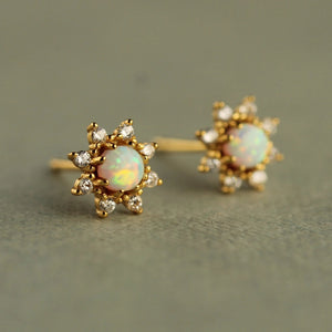 These Opal Flower Stud Earrings are the kind of understated show-stoppers that make people lean in for a closer look. Crafted from glowing white opals, each gem is nestled in a dainty floral setting of gold-plated sterling silver. Flecks of gold and turquoise shimmer from within as they catch the light, like miniature galaxies tucked behind your hair.