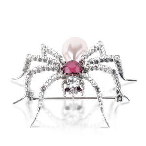 Make a spine-tingling statement with the Pearl Spider Brooch by Bill Skinner. This high-polish rhodium-plated beauty is more than just jewellery, it’s wearable art. With a body crafted from a luminous pearl drop and faceted amethyst-hued crystals, this brooch is equal parts creepy and couture.