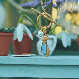 Crafted with care and a pinch of magic, Flopsy is hand-painted in vivid enamel and hangs gracefully from a luxurious gold-plated chain. A single faux pearl adds just the right touch of elegance, while the characterful toggle clasp gives this nostalgic piece a fresh, modern twist.