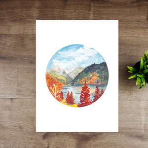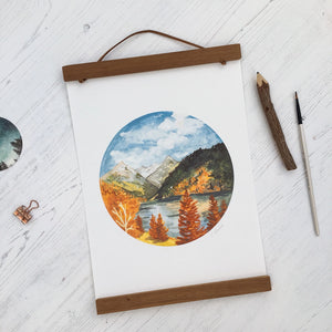 Crisp skies, golden trees, and snow-dusted peaks, this print captures autumn in the Rockies at its most breathtaking. Originally painted in gouache with delicate detail, this reproduction brings the rugged romance of mountain landscapes straight to your walls.