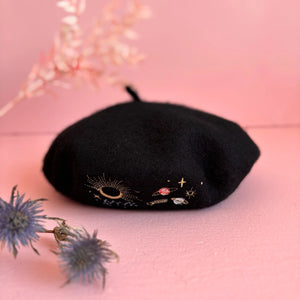 The After Dark Black Beret is here to add a cosmic twist to your wardrobe. With golden stars, glittering constellations, and planetary detail orbiting across its crown, this embroidered beauty turns heads faster than a meteor shower.