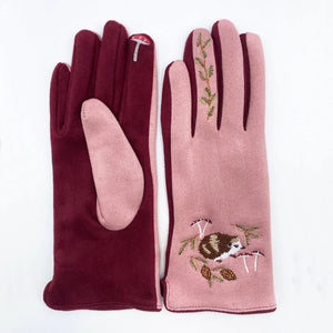 These whimsical fashion gloves are pure fairytale for your fingertips. In a rich navy blue with soft grey accents, they feature an embroidered hedgehog snuffling through delicate foliage, finished with pink piping and touch-screen tips so you can text through the frost. Cosy, clever, and a little bit woodland magic.