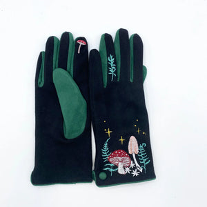 Wander into winter wrapped in whimsy with these beautifully embroidered Forage Gloves. Adorned with an enchanting scene of forest ferns and fairytale mushrooms, they’re the perfect finishing touch to your seasonal look. Black with forest green accents, they blend classic style with a curious twist, and yes, they’re as cosy as they look.