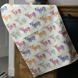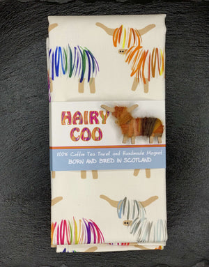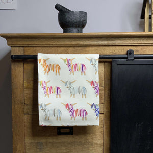 Each of our hairy coo tea towels is made from 100% cotton and features a plethora of highland cows in different bright colours. There is a little added bonus here as each tea towel comes complete with its very own handmade hairy coo magnet.