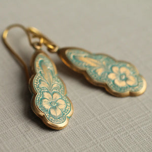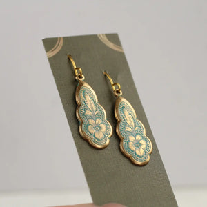 Our Pansy Gold Green Victorian Drop Earrings are a delicate nod to Art Nouveau elegance. Each earring features an intricately engraved pansy and feather motif, etched into solid brass and finished with a rich, antique gold tone. Subtle touches of deep green enamel bring the floral filigree to life, giving it the soft glow of a treasured heirloom.