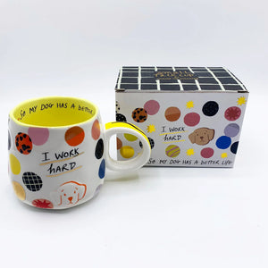 This cheerful little mug is here to remind you (and everyone else) why you’re hustling so hard: for the love of your pup. With its hand-thrown wonky charm and vibrant dotty print, the I Work Hard Mug is a playful nod to your devotion to the goodest boy or girl in your life. On the front, a 3D dog and the phrase “I Work Hard” leads to a hidden punchline on the inside rim: “…so my dog has a better life.”