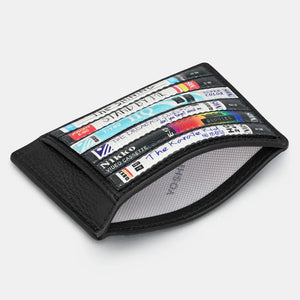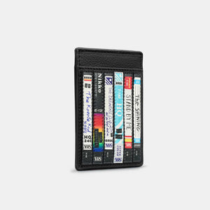 Take a nostalgic trip back to the golden age of VHS with the Yoshi Be Kind Rewind Compact Leather Card Holder. Crafted from premium black leather, this sleek and stylish accessory is perfect for retro lovers and film enthusiasts alike. Featuring an intricate appliqué design of stacked VHS tapes with handwritten-style labels, it adds a playful yet sophisticated touch to your everyday essentials.
