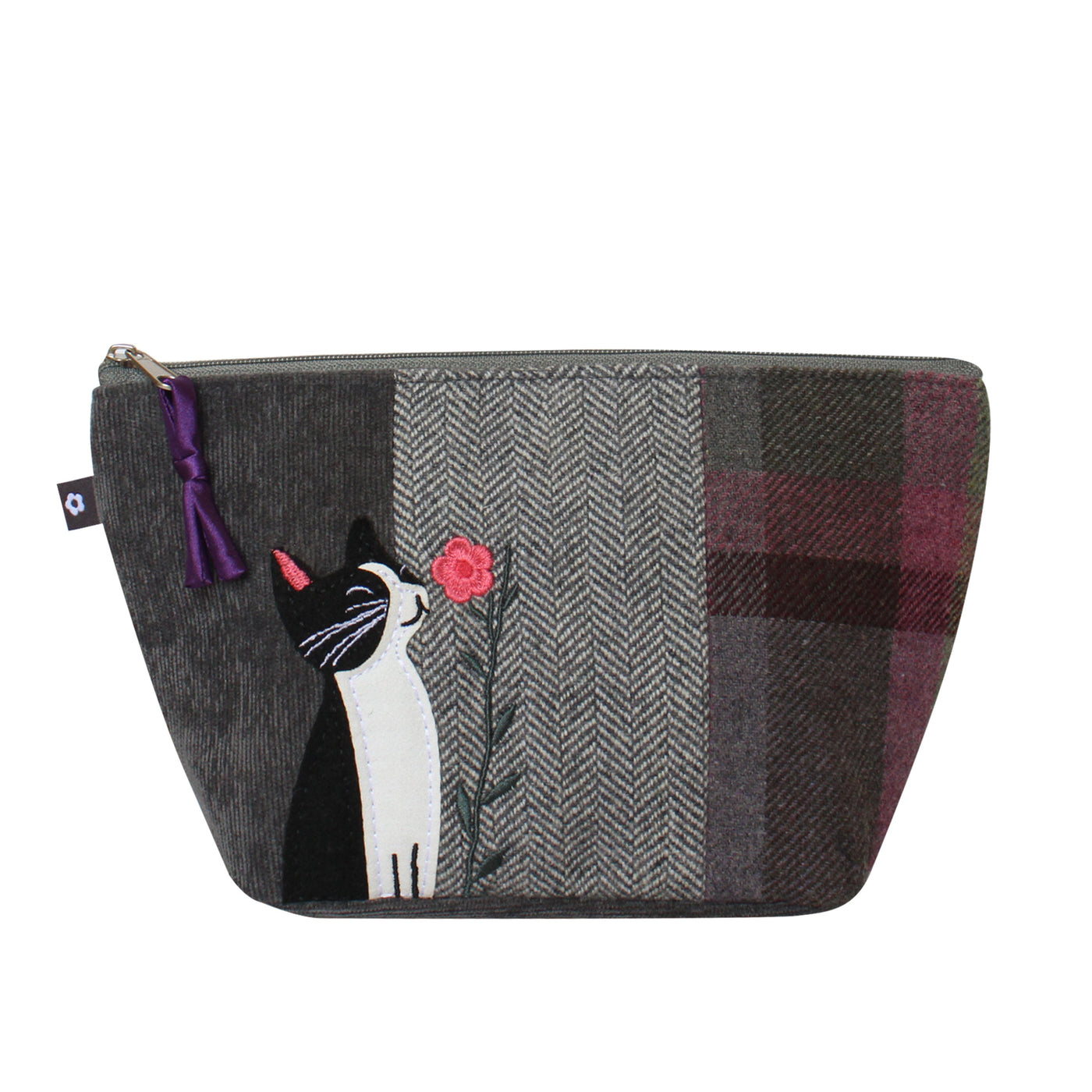 This cheerful cosmetics case is perfect for keeping your everyday essentials together. The adorable cat and flower applique adds personality to Earth Squared's trademark tweed, finished with a cute satin zip pull.