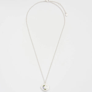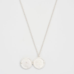 Crafted in worn sterling silver-plated brass, the round locket is adorned with hand-painted enamel nightshade leaves entwined beneath a serene crescent moon, watched over by a single white cubic zirconia star. Suspended from a vintage-style chain, it’s a piece that honours stories untold and moments you’ll never forget.