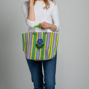 This lovely market tote showcases a delicate embroidered flower design against bright deck chair stripes that capture the essence of summer. Hand-stitched with care, each bag is a unique piece of wearable art.