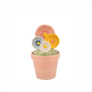 This delightful set features four ceramic measuring spoons, each shaped as a different flower - a pink rose, blue forget-me-not, white daisy, and yellow sunflower. They nest perfectly in their own miniature terracotta-style pot for charming countertop storage. A beautiful piece from our kitchenware collection.