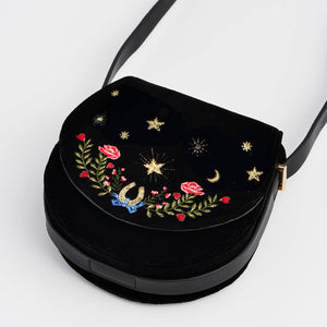 This beautiful bag showcases exquisite embroidery featuring white doves in flight surrounded by pretty floral star motifs in soft pinks and reds. The sumptuous black velvet adds a touch of luxury that elevates any outfit.