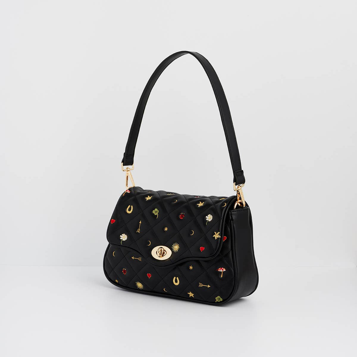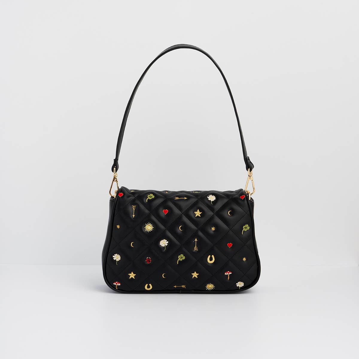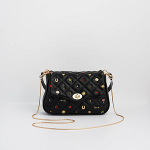 This stunning crossbody combines quilted black faux leather with delicate floral motifs in vibrant pinks, oranges and greens. The result is a bag that works just as well for weekend brunches as it does for evening drinks.