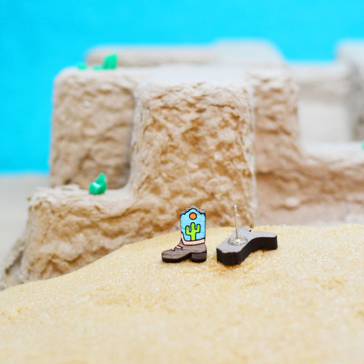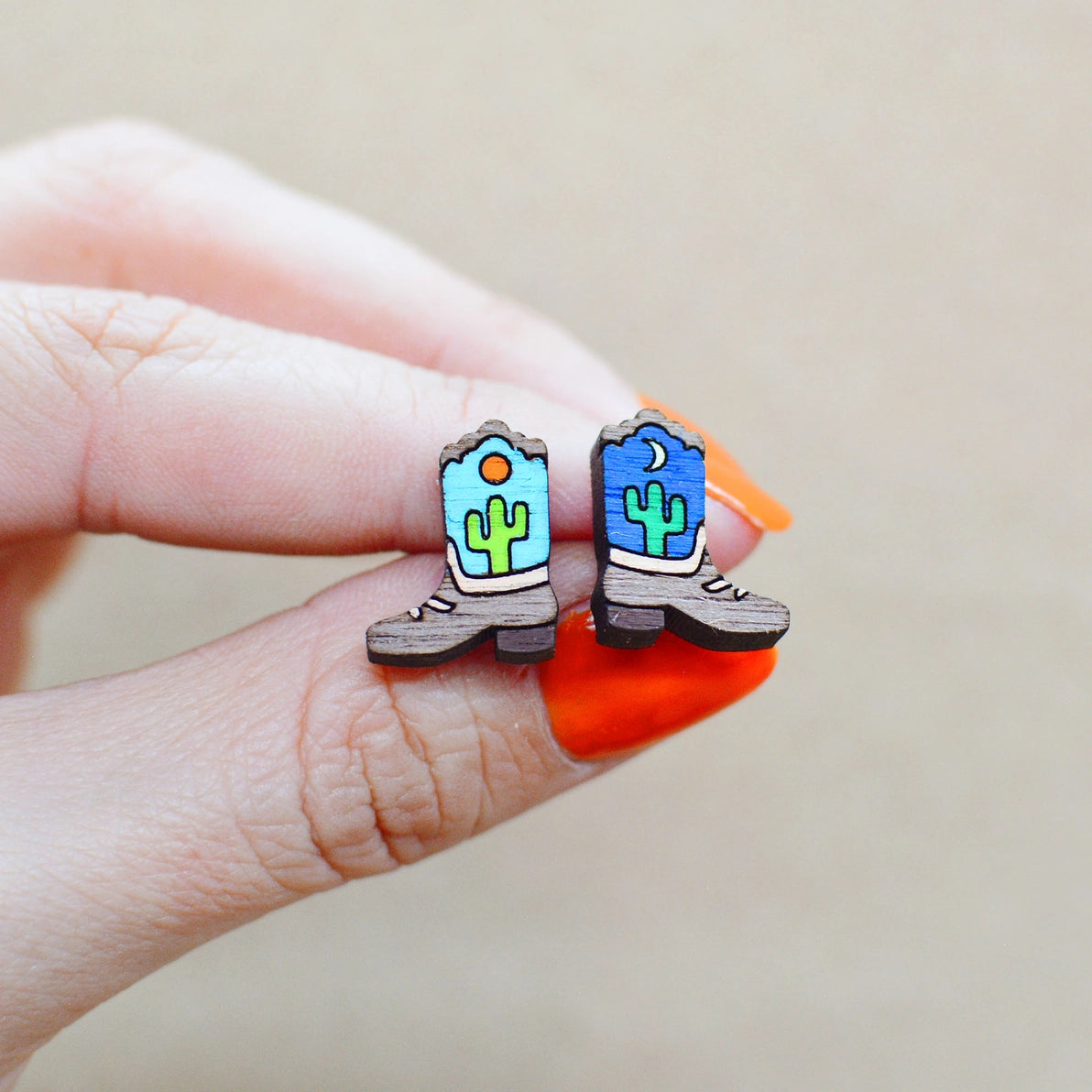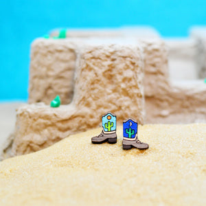 These Cowboy Boot Stud Earrings bring a playful Western twist to your everyday style, featuring two mismatched designs – one showing a sunny desert cactus scene, the other a moonlit night.