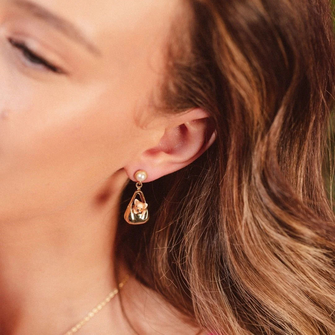 Crafted in gold-plated brass and finished with hand-painted enamel, these delightful earrings feature a tiny dog nestled in a chic handbag, suspended beneath a dainty faux pearl stud.