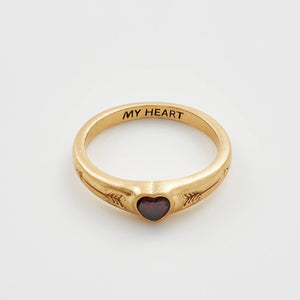 Finished in 22ct worn gold plating, this heart signet ring features a red cubic zirconia heart and a hidden inner engraving that reads My Heart. The tapered band sits comfortably for everyday wear, while the petite heart detail keeps it romantic rather than shouty.