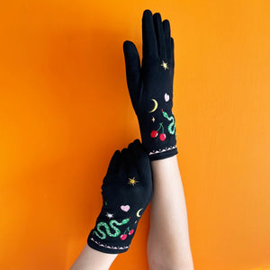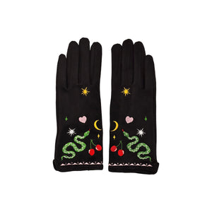 Add an edgy twist to your winter look with our Inked Embroidered Snake Gloves. Inspired by bold, vintage tattoo art, these black suedette gloves feature vibrant embroidery of hearts, cherries, crescent moons, and serpents - a perfect mix of rebellion and charm.