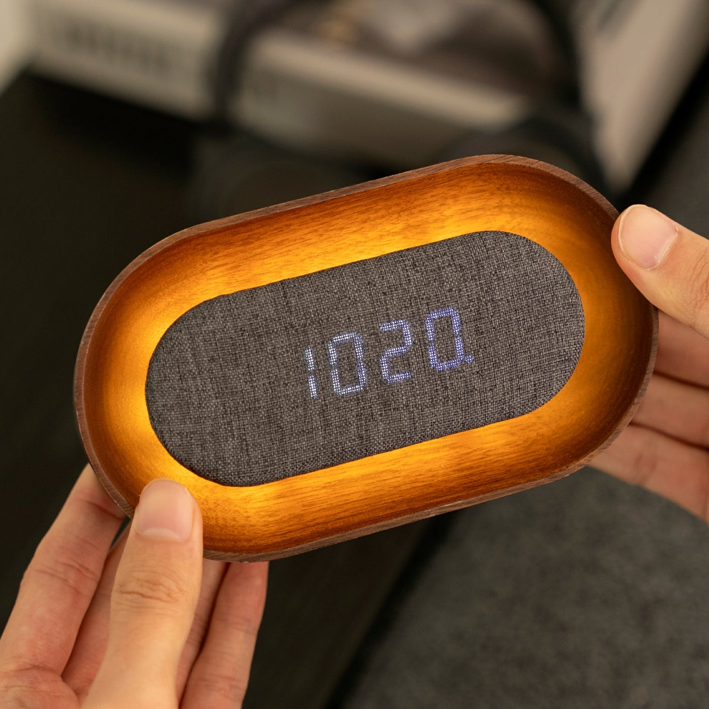 The Lumos Clock pairs a warm walnut wood frame with a sleek fabric display, plus three tap-controlled light levels for bedtime ambience and gentler mornings. It also features alarm and snooze functions, with a sound-activation mode that keeps things calm until you tap or make a little noise.