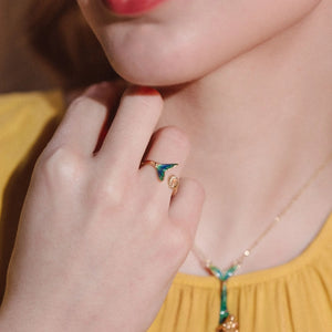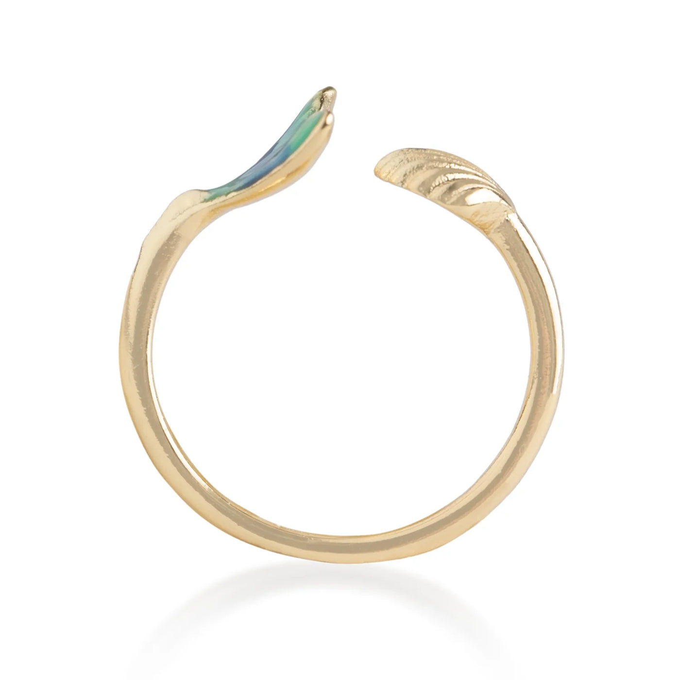 Crafted in gold-plated brass, this adjustable ring wraps gracefully around your finger, featuring a shimmering hand-painted mermaid tail paired with a delicately detailed seashell.