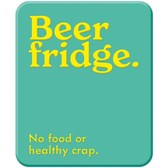 - Reads "Beer fridge. No food or healthy crap."