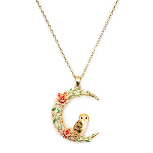 A hand-painted barn owl perches gracefully on a golden crescent moon entwined with enamelled blossoms and leafy detailing. Crafted in gold-plated brass, this pendant shimmers softly against the skin - a symbol of wisdom, serenity, and beauty.