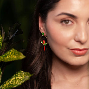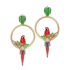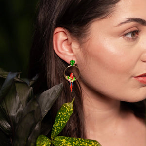 These Parrot Front-Facing Earrings by Bill Skinner are not for the faint of flair. Bold, bright, and bursting with tropical personality, these hand-painted beauties perch perfectly in a golden hoop, peeking out with beady charm and tail feathers to match.